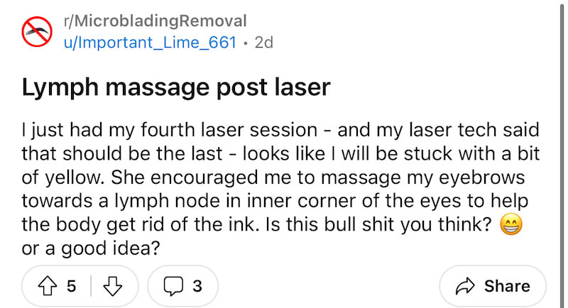 The third, and perhaps most important fact is that there is no evidence to date that lymphatic drainage massage somehow helps accelerate the removal of tattoo pigment and PMU from the skin. In the last 30 years of scientific publications, I have never come across any such work that at least put forward such a theory. Yes, it is a very appealing theory that simply massage for the purpose of lymphatic drainage can speed up eyebrow permanent makeup removal with massage. And yes, there is logic and some potential explanation for this, at least I want to believe it. But as a scientist, I have to reject such a recommendation until it is proven effective, and it is not. That is, you can believe in it and even perform such massage and it may even help somehow, but until there is no statistical data, then unfortunately it is just a hypothesis. Well, and there is such a concept as economic feasibility – imagine that lymphatic drainage massage really helps to speed up eyebrow permanent makeup removal with massage, but in the end by 2% for example (this is just a figure from my head and I’m fantasizing). Does it make sense to waste tens of hours of your life on this? So there has to be an evidence base and statistics, then and only then can you recommend something to clients. These are the laws of science and evidence-based medicine!